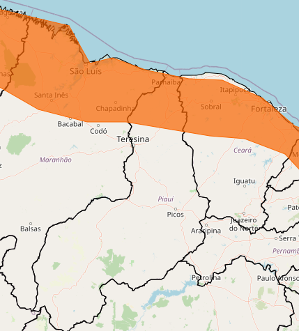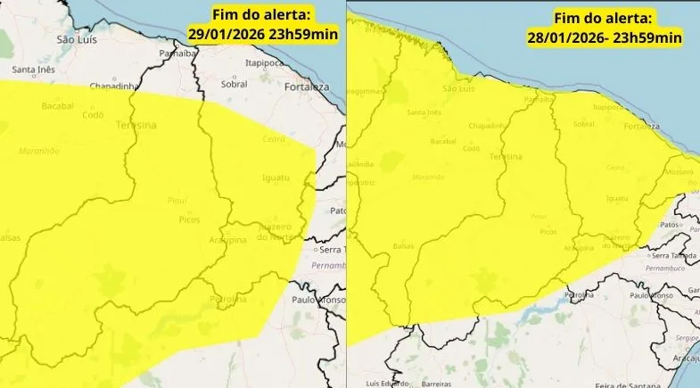 O aviso mais severo atinge o Norte e o litoral do Piauí, com início às 10h desta quarta-feira (28) e validade até 10h de quinta-feira (29). Nessas áreas, são esperadas chuvas mais volumosas, entre 30 e 60 mm por hora ou de 50 a 100 mm por dia, além de ventos fortes que podem variar entre 60 e 100 km/h.